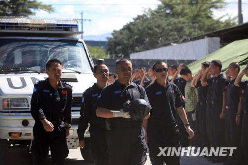 1月16日,在海地首都太子港,中國駐海地維和警察防暴隊的官兵運送被埋戰友遺體回營地。新華社記者邢廣利攝