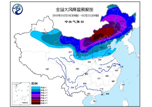19日08時至21日08時,新疆東部和沿天山地區、西北地區東部、內蒙古、華北、東北、黃淮北部等地自西向東將先后有5~6級、陣風7~8級偏北風,新疆山口地區風力可達8~10級;上述地區的氣溫將下降8~12℃,其中,內蒙古中東部、東北地區西部的部分地區溫度降幅可達14~18℃,局部地區有18~20℃。20日早晨,阿勒泰地區的最低氣溫將下降到零下35至零下43℃。20日、21日早晨,內蒙古東北部的最低氣溫也將下降到零下30至零下35℃,局地達零下40℃。