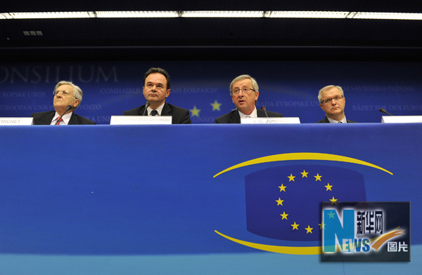 5月2日,在比利時首都布魯塞爾,歐洲央行行長特里謝、希臘財政部長帕帕康斯坦季努、歐元集團(tuán)主席、盧森堡首相容克及歐盟委員會負(fù)責(zé)經(jīng)濟(jì)和貨幣事務(wù)的委員雷恩(從左至右)出席歐元區(qū)成員國財政部長會議后的新聞發(fā)布會。當(dāng)天,歐元區(qū)財政部長同意在未來的三年內(nèi)為希臘政府提供800億歐元貸款,以幫助陷入債務(wù)危機(jī)的希臘渡過難關(guān)。新華社記者武巍攝