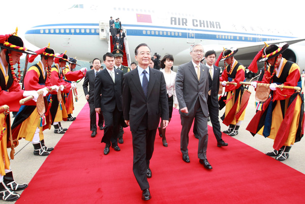 5月28日,中國國務院總理溫家寶抵達首爾,開始對韓國進行正式訪問,并將出席在濟州島舉行的第三次中日韓領導人會議。 新華社記者 龐興雷攝