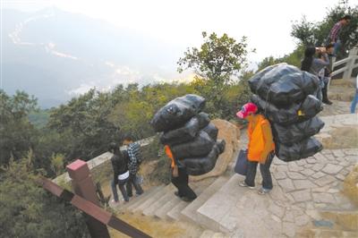 下午5時(shí)30分左右,太陽落山,長城上的游客陸續(xù)開始散去。此時(shí),清潔工們開始最后一次全面清理。“四樓以上沒有燈,天黑了就什么也看不見了,必須抓緊時(shí)間下山。”王化金說罷,便幫瘦弱的妻子背上3袋瓶子、1袋垃圾,自己背上了1袋瓶子和3袋垃圾。