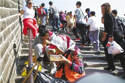 自2007年開始在長城進(jìn)行清潔工作,高俊經(jīng)歷了6個(gè)十一黃金周。今年,高俊更是帶著自己還在上高一的女兒上長城幫忙。