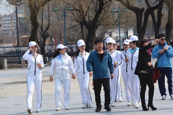 2015年4月15日,吉林省吉林市,一批來自北朝鮮的女留學(xué)生和來中國勞務(wù)的女義工們共同走進金日成母校吉林毓文中學(xué)參觀學(xué)習(xí),又游覽了吉林市著名的北山風(fēng)景區(qū)風(fēng)光,并集體合影留念。圖為負責(zé)老師和留學(xué)生們走在景區(qū)街頭。