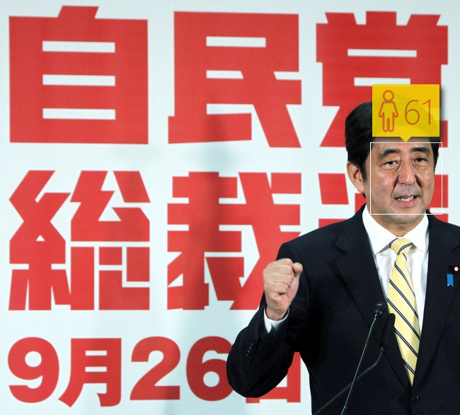 照片時間:2012年9月26日。2012年12月26日,日本國會眾參兩院舉行首相指名選舉,執政黨自民黨總裁安倍時隔5年3個月第二次就任首相。“顏齡測試”給出的結果是61歲,比他的實際年齡長3歲。