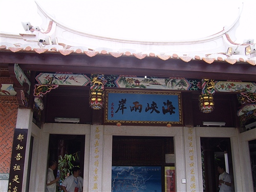 走進廈門園區,紅磚大瓦墻體、前后厝花園設計、燕尾飛檐屋頂,此外,再加上古厝前方戲臺上,以二胡為主要演奏樂器的歌仔戲表演,一股濃濃的閩南味撲面而來。廈門建設園區主要由3座古厝組成,其中一間名為“海峽兩岸”的古厝為中國國民黨榮譽主席連戰親筆題詞。走進古厝,環境清幽,內堂墻上掛有閩南古厝的介紹。閩南傳統建筑既有中國傳統建筑對稱、嚴整和封閉的性格,又具有華麗活潑、夸張矯飾的特征。彎曲的屋面、高翹的燕尾、花枝招展的剪粘、堆砌的水車堵,色彩斑斕的鏡面墻……處處表達出閩南建筑特有的風格。