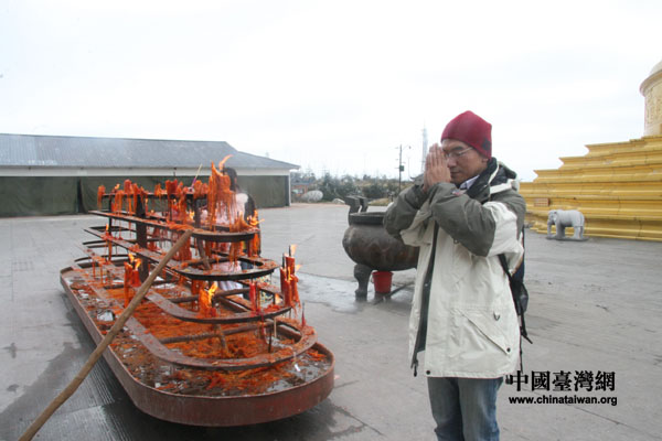 臺灣《聯合報》記者在華藏寺大殿前拜祭許愿(攝影:陳寧)