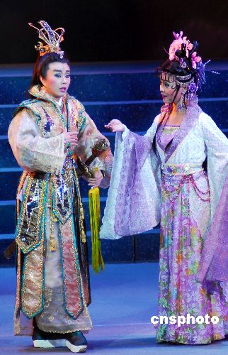 十一月三日晚,有臺灣“無敵小生”美譽的歌仔戲“頭牌”女藝人孫翠鳳(左)首度亮相上海,公演《劍神呂洞賓》,引發上海新老戲迷轟動。孫翠鳳所在的臺灣明華園是時下寶島首屈一指的歌仔戲劇團。繼1990年赴北京公演后,此番明華園將首度在上海、杭州、南昌、深圳等城市舉行規模空前的內地巡演。 中新社發 明華園 攝