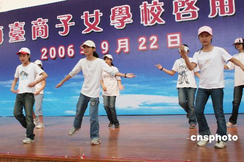 資料圖:2006年9月22日,大陸第三所專門服務臺商子女的學校——上海臺商子女學校校舍竣工啟用。據介紹,目前該校共有三百多名臺灣學生就讀,學制涉及幼兒園到初中。圖為臺灣學生載歌載舞慶祝校舍啟用。 中新社發 許曉青 攝