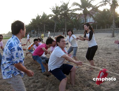第二屆“歡聚海南大學”兩岸大學生冬令營11月13日舉行“深深相連”沙灘拔河比賽活動。圖為臺灣學生奮力拔河,粉絲團在旁邊吶喊助威。 中新社發 彭小云 攝