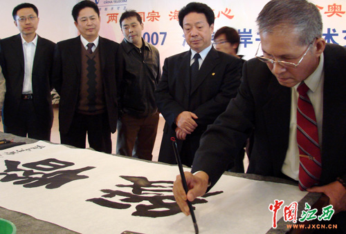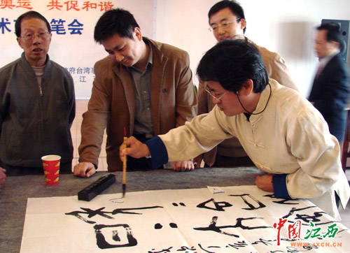 當(dāng)日,海峽兩岸書(shū)畫(huà)藝術(shù)交流筆會(huì)在南昌市畫(huà)院舉行,李豆羅為筆會(huì)開(kāi)筆。接著,臺(tái)灣中華書(shū)學(xué)會(huì)理事長(zhǎng)嚴(yán)建忠提筆寫(xiě)下“惜緣”二字,表達(dá)出現(xiàn)場(chǎng)十余位書(shū)畫(huà)藝術(shù)家的共同心聲:兩岸同宗,海峽連心,齊盼奧運(yùn),共促和諧。龔朝陽(yáng)、何正一、簡(jiǎn)英智、吳金城,游新民、周京山、王迎春、張維欣等海峽兩岸書(shū)畫(huà)藝術(shù)家也分別留下作品,表達(dá)美好祝愿。