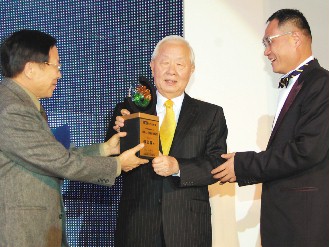 臺積電董事長張忠謀(中)獲全球華人企業領袖終身成就獎。