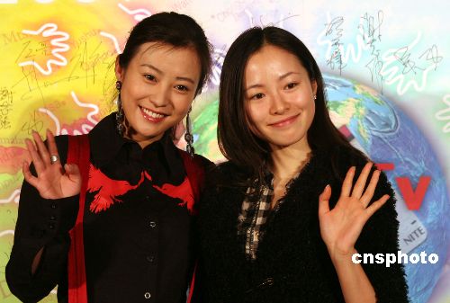 十二月四日,大陸知名演員郝蕾(左)、江一燕在臺北參加“二00七臺灣國際影視創投會”開幕式,成為媒體競相拍照的焦點。 中新社發 董會峰 攝