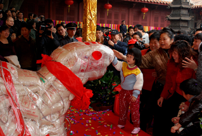 2月22日,福建泉州天后宮舉行傳統民俗“平安乞龜”揭彩儀式,一名小朋友撫摸“大米龜”。新華社發(顏財斌 攝)