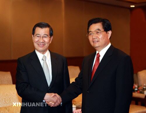 4月12日,中共中央總書記胡錦濤在海南省博鰲會見蕭萬長先生率領(lǐng)的臺灣兩岸共同市場基金會代表團(tuán)一行。 新華社記者鞠鵬攝