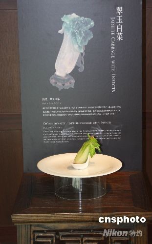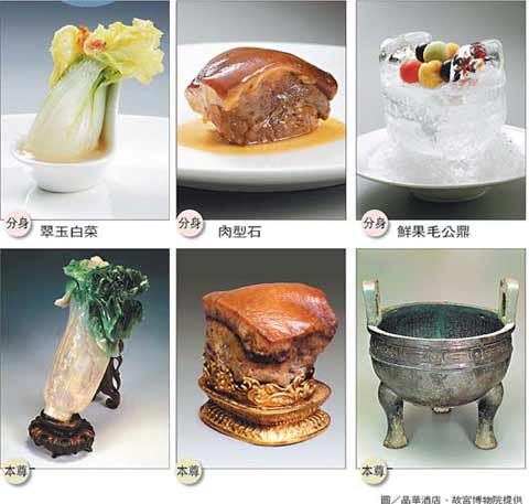 古香古色的餐廳內(nèi),擺放深色的硬木桌椅,墻面飾以大文豪蘇軾的后赤壁賦及清明上河圖,還有描繪文人雅士相聚品茗的《宋徽宗文會(huì)圖》。服務(wù)員首先為記者端上的是故宮珍寶中知名度極高的“翠玉白菜”:一棵迷你白菜斜倚在白色的湯匙上,其形酷似珍寶原件。