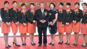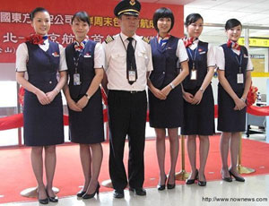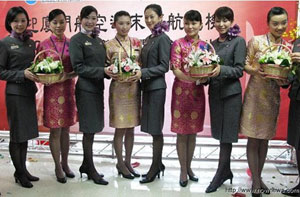 廈門航空的空姐相當(dāng)特殊地穿著一身改良式的短裙旗袍,顯得特別亮眼。東方航空隨機(jī)的5位空姐,其中經(jīng)常出現(xiàn)于東航宣傳片中的鄭相君,此次歷史性的首航再度現(xiàn)身于臺(tái)北。每回東航重要的包機(jī)任務(wù),總會(huì)指派鄭相君,上次國民黨主席吳伯雄走訪大陸,所搭乘的東航包機(jī),就曾隨機(jī)服務(wù),而今天吳伯雄也特別出席東航首航的儀式,再度相逢。