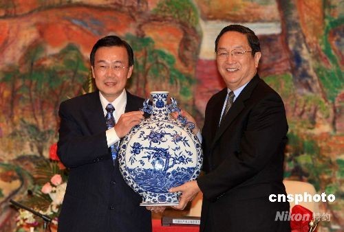 會見后,俞正聲向訪問團贈送了清乾隆時期景德鎮青花扁瓶珍貴高仿品。訪問團則回贈了《事事如意》金箔工藝畫和臺灣特色的鶯歌陶瓷瓶,瓶名為“和諧共贏”。