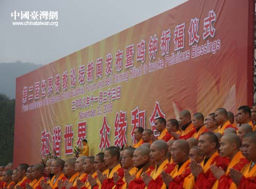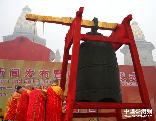 中國臺灣網11月24日無錫消息 昨天上午,第二屆世界佛教論壇新聞發布暨鳴鐘祈福儀式在無錫靈山舉行。中國佛教協會會長一誠長老、國際佛光會總會長星云大師、香港佛教聯合會會長覺光長老于同一時刻分別在無錫、高雄、香港三地敲響祈福鐘聲。帶著兩岸三地佛教界對世界和平、社會和諧、兩岸和睦的美好祝愿,莊嚴深沉的鐘聲遠揚。