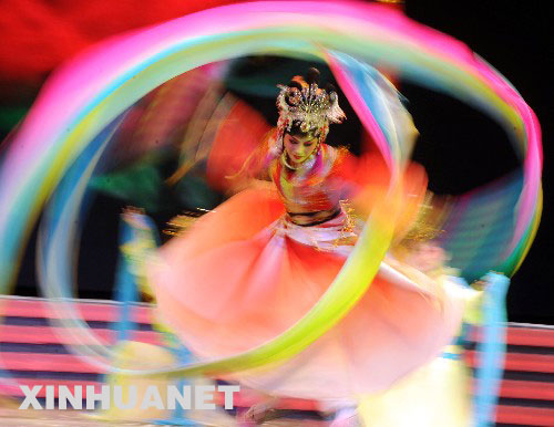 11月26日,廈門小白鷺民間舞團和廈門藝術學校的演員在表演舞蹈《開門紅》。當日,首屆海峽兩岸(廈門)文化產業博覽交易會開幕式文藝晚會在廈門人民會堂舉行,來自海峽兩岸的藝術家同臺演出,共敘文緣。 新華社記者 姜克紅 攝