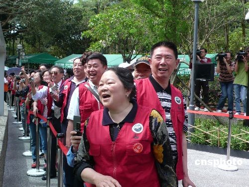 四月十八日上午,四川赴臺(tái)灣旅游首發(fā)團(tuán)在臺(tái)北動(dòng)物園熊貓館游覽。中新社發(fā) 鄧敏 攝
