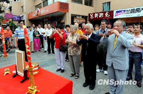 中新社福州十月九日電 (記者 孫賢迅)福州北郊蓮花峰下閩王王審知陵園九日香火繚繞,鑼鼓喧天、法號齊鳴,海峽兩岸王氏宗親在臺灣“立法院長”王金平的胞兄王珠慶、福建省王審知研究會會長王惠民等率領下向先祖王審知敬香、行三拜九叩大禮。王珠慶冀望海峽兩岸和諧共生、和平發展。