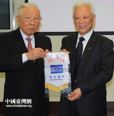 民革中央主席周鐵農(nóng)(右)與臺灣新同盟會會長許歷農(nóng)(左)互贈禮物。(中國臺灣網(wǎng) 高斯斯 攝)