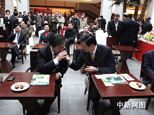剛剛結(jié)束寧臺(tái)“雙城論壇”開(kāi)幕式的臺(tái)北縣縣長(zhǎng)周錫瑋和南京市代市長(zhǎng)季建業(yè)品茶小憩,饒有興味地交流了彼此對(duì)茶道的理解。 申冉 攝