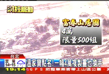 據(jù)臺灣TVBS報道,2010臺北禮品展開跑,臺北故宮今年第3次參展,也是規(guī)模最大一次。此次臺北故宮特別把溫家寶提過的富春山居圖制作成復(fù)刻板,限量500套,雖然一幅4萬元(新臺幣,下同),但一開賣就被訂走50套。