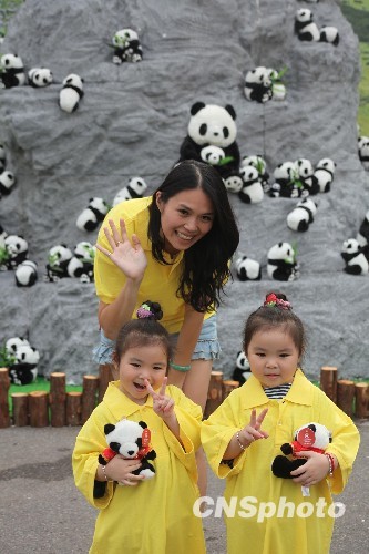 5月24日,近千只從四川空運(yùn)來臺的熊貓玩偶在臺北繁華商業(yè)街區(qū)打造一個大型熊貓樂園,吸引眾多臺北民眾帶著孩子來游玩。圖為一對雙胞胎臺灣小女孩和她們的媽媽身穿熊貓T恤,手抱熊貓玩偶,一起在熊貓玩偶裝點(diǎn)的熊貓樂園里快樂合影留念。 中新社發(fā) 羅欽文 攝