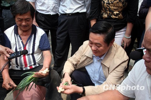 劉奇葆還來到老人們耕種的菜地,恰遇一位村里的聾啞老人在勞動,劉奇葆連忙握手問候。當?shù)弥@位聾啞老人因年齡未到還不能領(lǐng)取福利金,需經(jīng)常自己打拼賺錢時,劉奇葆連連向他豎起大拇指。