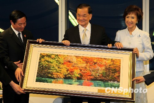 5月27日晚,中國國民黨榮譽主席連戰在臺北101大樓會見“好朋友、老朋友”中共四川省委書記劉奇葆,一連贈送5件禮物,劉奇葆(左)則回贈蜀繡《九寨溝春色》。圖右為連戰夫人連方瑀。 中新社發 董會峰 攝