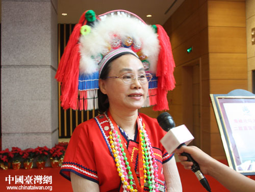阿美族代表林靜玉在海峽論壇場外接受采訪。(中國臺灣網(wǎng) 徐麗華 攝)