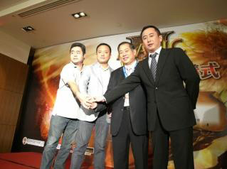 游戲新干線董事長王俊博(右二)取得盛大游戲旗下《MAGIC WORLD II Online》臺、港、澳三地營運(yùn)權(quán)。圖片來源:臺灣“今日新聞網(wǎng)”