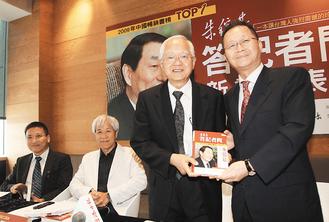 臺灣《經濟日報》出版的《朱镕基答記者問》繁體字版新書發表會,由臺灣金傳媒執行長楊仁烽(右)主持,大陸學者吳敬璉(左)接受贈書。記者黃義書/攝影