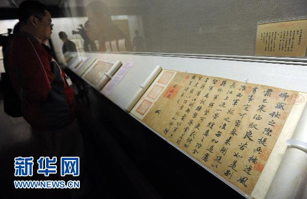 10月7日,參觀者在臺北故宮博物院觀看展品!拔乃嚱B興——南宋藝術與文化特展”將于10月8日至12月26日在臺北故宮博物院舉行,展出來自兩岸及日本十余個博物館的大量南宋時期珍貴文物和文獻資料,全方位展現南宋在文化與藝術方面的成就。新華社發(吳景騰 攝)