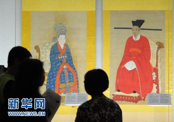 10月7日,參觀者在臺北故宮博物院欣賞《宋寧宗坐像》(右)與《宋寧宗后坐像》。新華社發(吳景騰 攝)