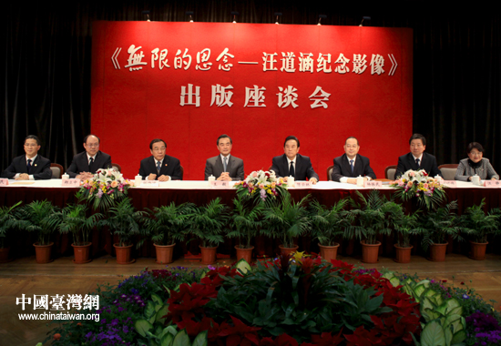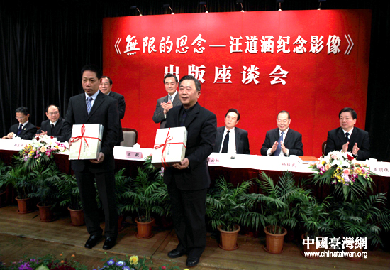 中國(guó)臺(tái)灣網(wǎng)上海12月24日消息 24日下午,由江澤民同志親筆題寫書名、曾慶紅同志作序的《無限的思念——汪道涵紀(jì)念影像》出版座談會(huì)在上海舉行。中共中央臺(tái)辦、國(guó)務(wù)院臺(tái)辦主任王毅,海峽兩岸關(guān)系協(xié)會(huì)會(huì)長(zhǎng)陳云林,中共上海市委常委楊曉渡、楊振武及汪老家屬、各界人士出席。