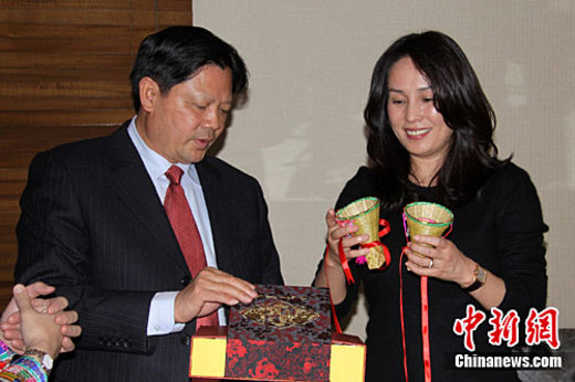 1月12日,“七彩云南 文化驚艷”民族文化交流訪問團在臺北舉行記者會。該訪問團將于近日在臺灣正式演出9場,交流演出3場,并有數場座談會。圖為高金素梅(右)與云南省臺辦主任巖莊茶敘,共同欣賞色彩絢麗的花腰傣民族工藝品。中新社記者 甘娜 攝