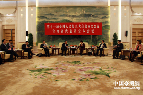 3月10日下午,十一屆全國人大四次會(huì)議臺(tái)灣省代表團(tuán)在人民大會(huì)堂臺(tái)灣廳舉行全體會(huì)議,審議全國人大常委會(huì)工作報(bào)告。
