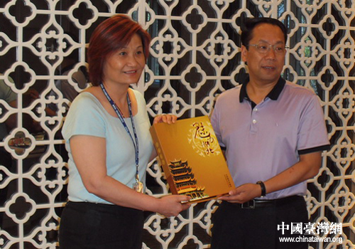 湖北省臺(tái)辦副主任章良華向北加州中國(guó)和平統(tǒng)一促進(jìn)會(huì)贈(zèng)送《湖北郵票紀(jì)念冊(cè)》(湖北省臺(tái)辦 唐傳林 攝)