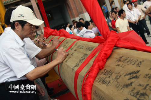 8月7日上午,慧聚寺天后宮舉行天王殿上梁典禮,臺商及信眾代表紛紛在梁木上留下自己的名字和祝福。(中國臺灣網 馬迪 攝)