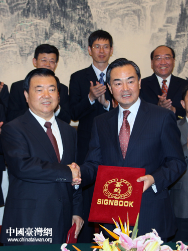 國務院臺灣事務辦公室與安徽省人民政府14日在北京簽署了促進安徽對臺交流合作備忘錄,圖為國臺辦主任王毅(右)與安徽省省長王三運(左)交換備忘錄文本。(中國臺灣網 楊麗 攝)