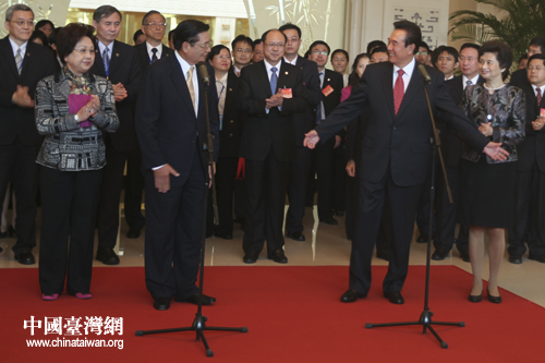 出席第七次兩岸兩會(huì)領(lǐng)導(dǎo)人會(huì)談的海基會(huì)董事長(zhǎng)江丙坤一行今日中午抵達(dá)天津,海協(xié)會(huì)會(huì)長(zhǎng)陳云林及相關(guān)人員在天津迎賓館歡迎海基會(huì)協(xié)商代表團(tuán)的到來。(中國(guó)臺(tái)灣網(wǎng) 陳佳慧 攝)