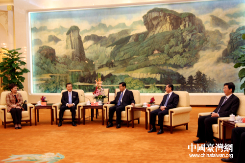 中共中央政治局常委、全國政協(xié)主席賈慶林在人民大會堂福建廳會見來京參加第十四屆京臺科技論壇的臺灣工商界代表。(中國臺灣網(wǎng) 張曉靜 攝)