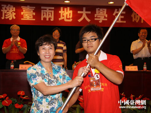 2011年7月15日,河南省臺辦主任宋麗萍為豫臺兩地大學生研習營授旗。(圖片來源:河南省臺辦)