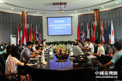 參加天府新區(qū)采訪活動的兩岸媒體記者在成都經(jīng)濟(jì)技術(shù)開發(fā)區(qū)座談采訪。(圖片來源:四川省臺辦)
