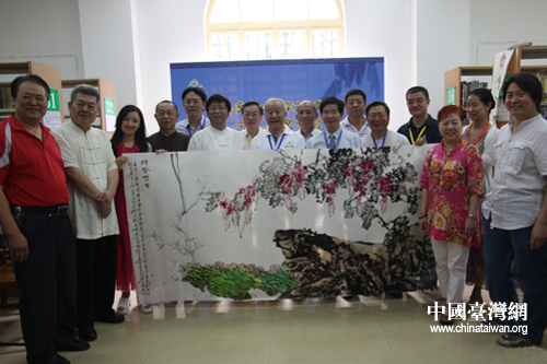 “情系齊魯——兩岸文化聯(lián)誼行”之兩岸文化交流筆會(huì)7月2日在濟(jì)南大明湖畔舉行。圖為兩岸畫(huà)家合作的大幅畫(huà)作。(中國(guó)臺(tái)灣網(wǎng) 蕪?fù)?nbsp;攝)