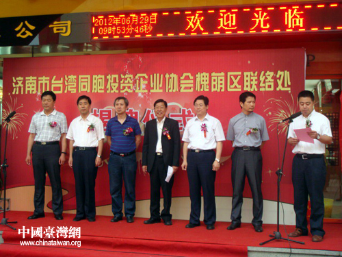 中國臺灣網(wǎng)7月2日濟(jì)南消息 日前,山東濟(jì)南市臺灣同胞投資企業(yè)協(xié)會槐蔭區(qū)聯(lián)絡(luò)處揭牌儀式在濟(jì)南市槐蔭區(qū)張莊路茶業(yè)市場舉行。山東省臺辦副主任曹曉武,濟(jì)南市臺辦副主任張端武,濟(jì)南市槐蔭區(qū)副區(qū)長董傳師,濟(jì)南市臺資企業(yè)協(xié)會會長王金銷、副會長陳世偉,濟(jì)南茶葉市場總經(jīng)理劉勇和部分臺商出席活動。