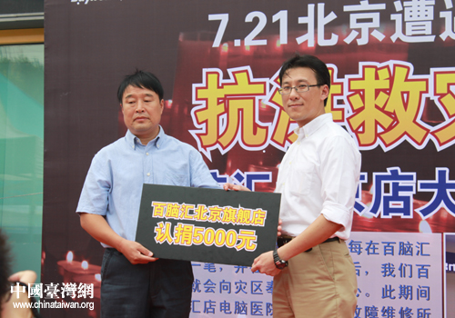 中國臺灣網7月30日北京消息 7月28日下午,臺資企業朝外岳秀百腦匯電子商場舉行“抗洪救災,大義北京”現場募捐義賣活動。短短兩個多小時,百腦匯電子商場組織廠家和商戶通過捐款、義賣、電腦免費維修、汽車涉水免費檢測等形式,為災區募集款項近兩萬元,并通過朝外街道吉祥里社區等渠道送往災區。駐足前來觀看的市民朋友也被現場的氛圍所感染,大家紛紛慷慨解囊,為災區獻上了一份愛心。