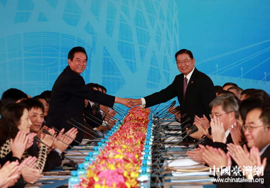 8月9日上午,兩岸兩會領導人第八次會談在臺北圓山飯店舉行。圖為海協會會長陳云林與臺灣海基會董事長江丙坤在會談前握手致意。(中國臺灣網 田云鵬 攝)
